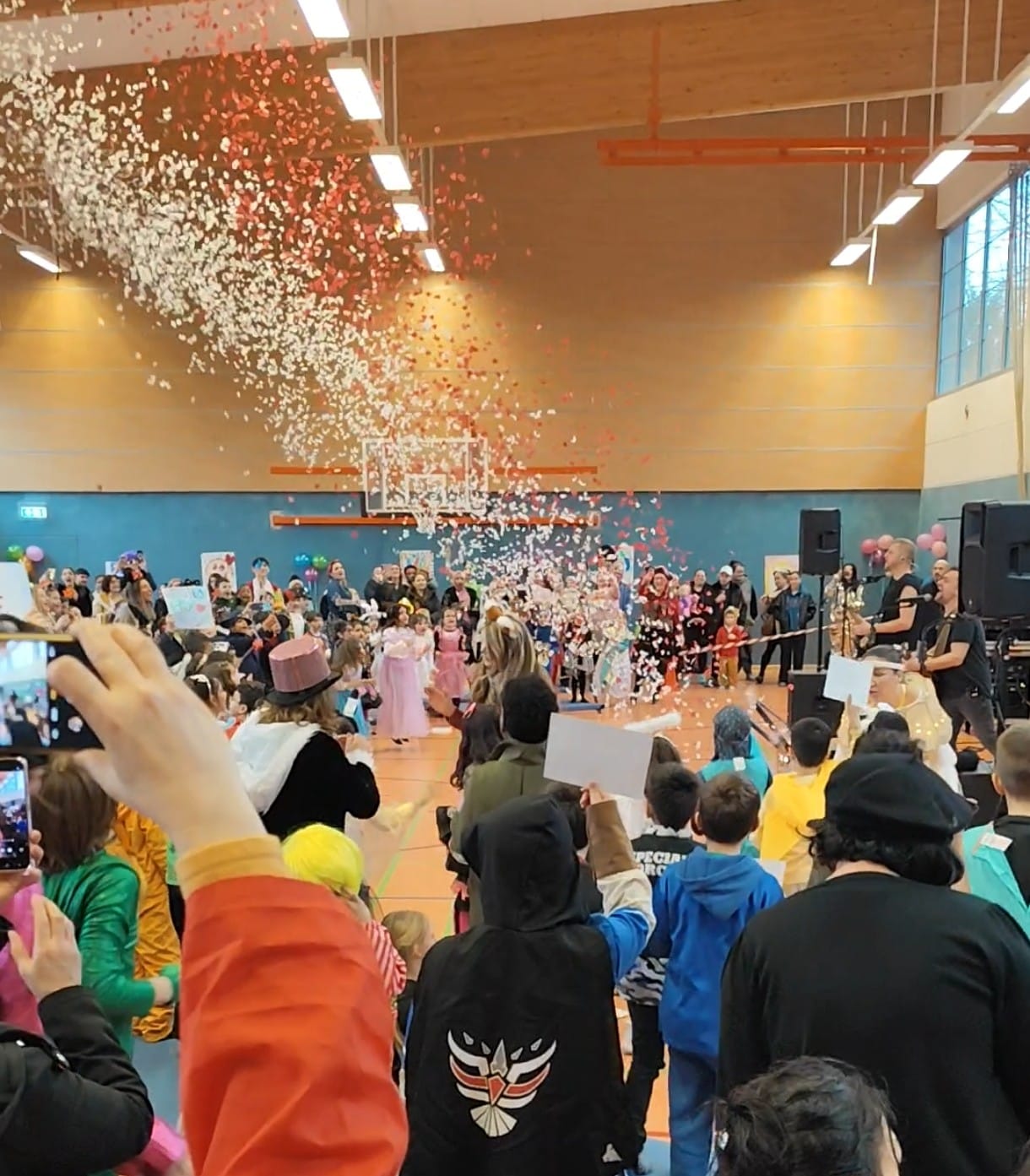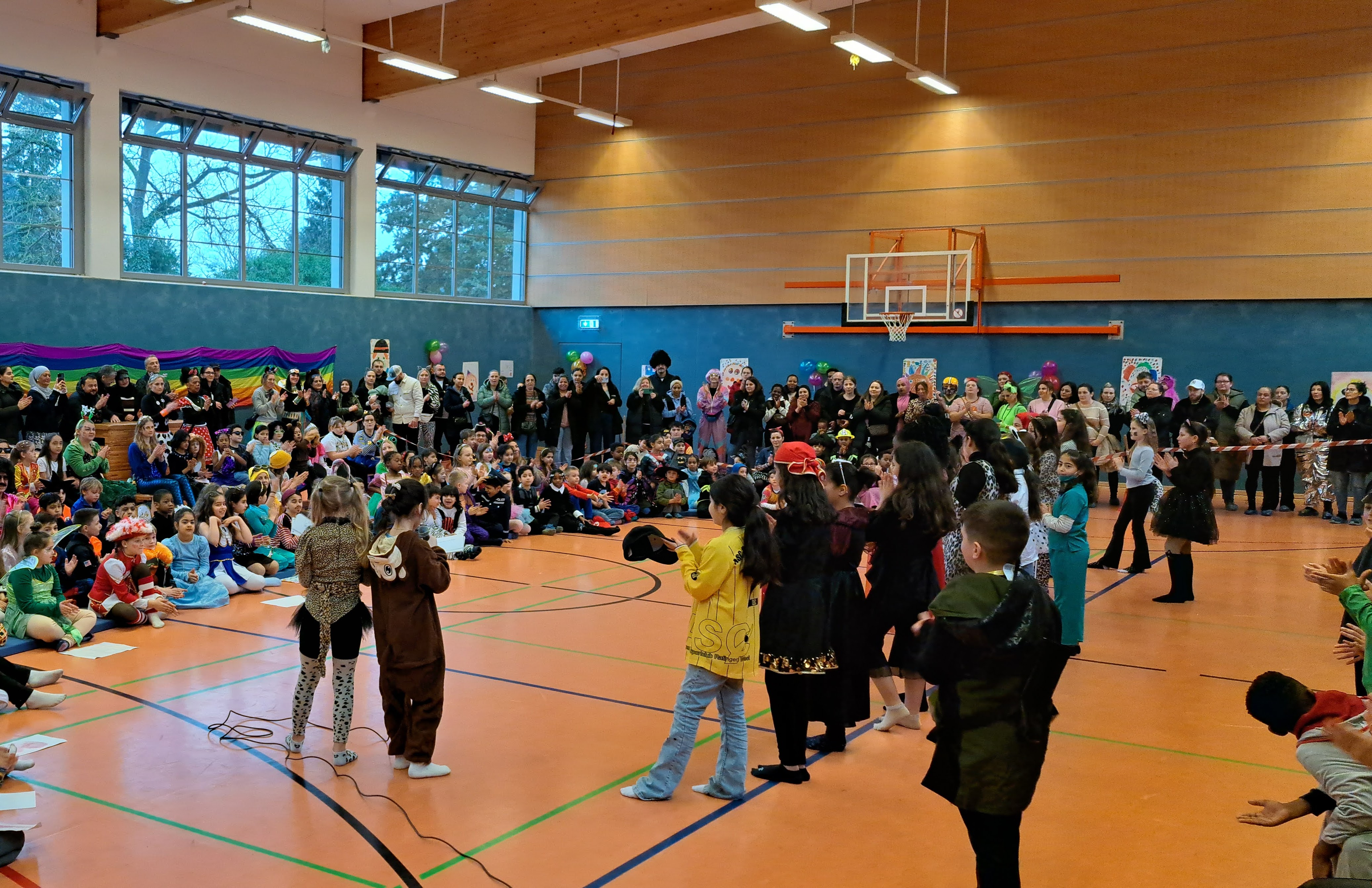 Zum Schluss waren alle Mitarbeitenden der Schule auf der Bühne mit ihrer Performance zu "Mahnah mahnah". Das war wirklich lustig. Viele Eltern besuchten uns und wir haben alle zusammen ausgelassen getanzt und gefeiert. ALAAF!!!