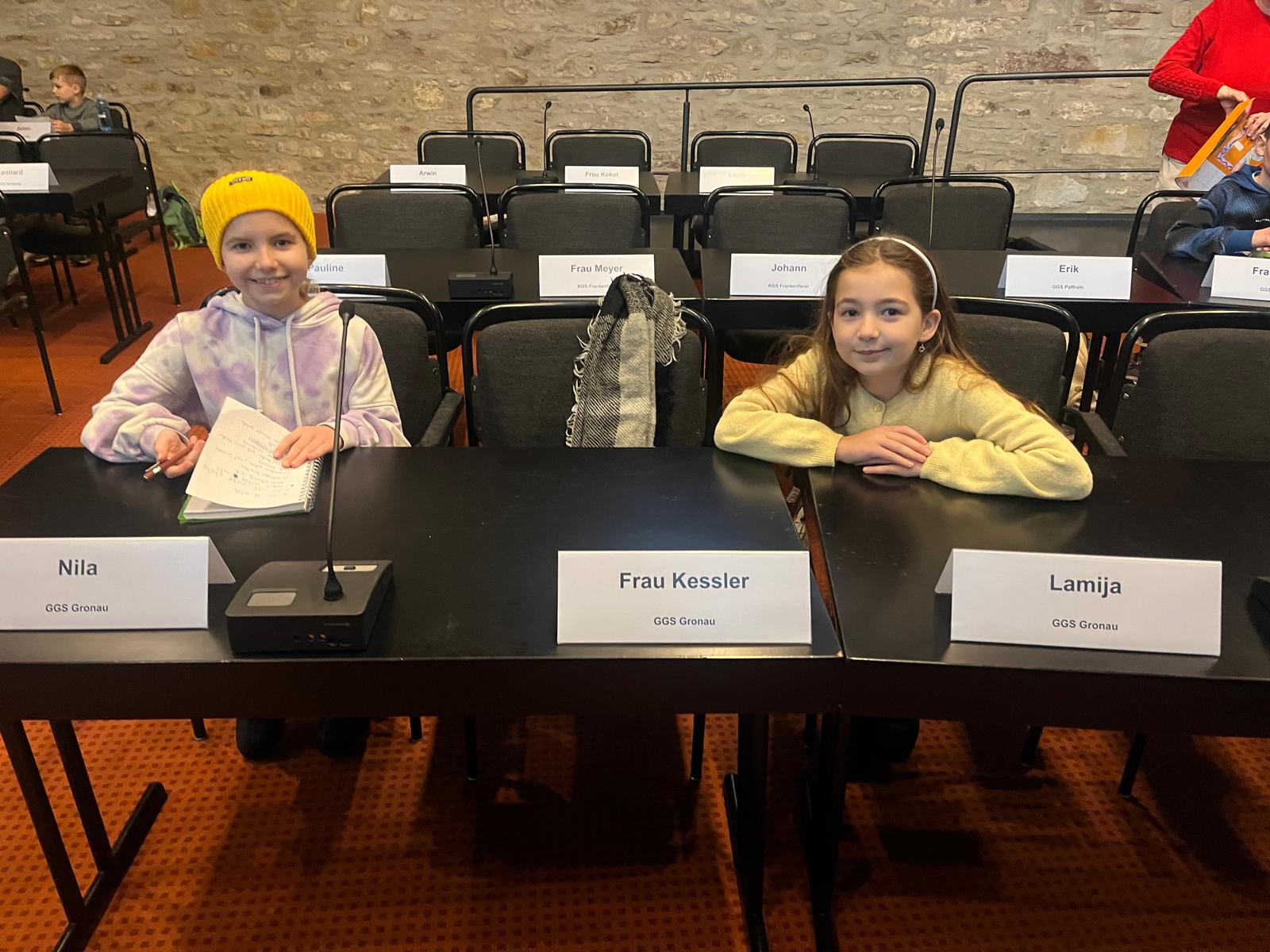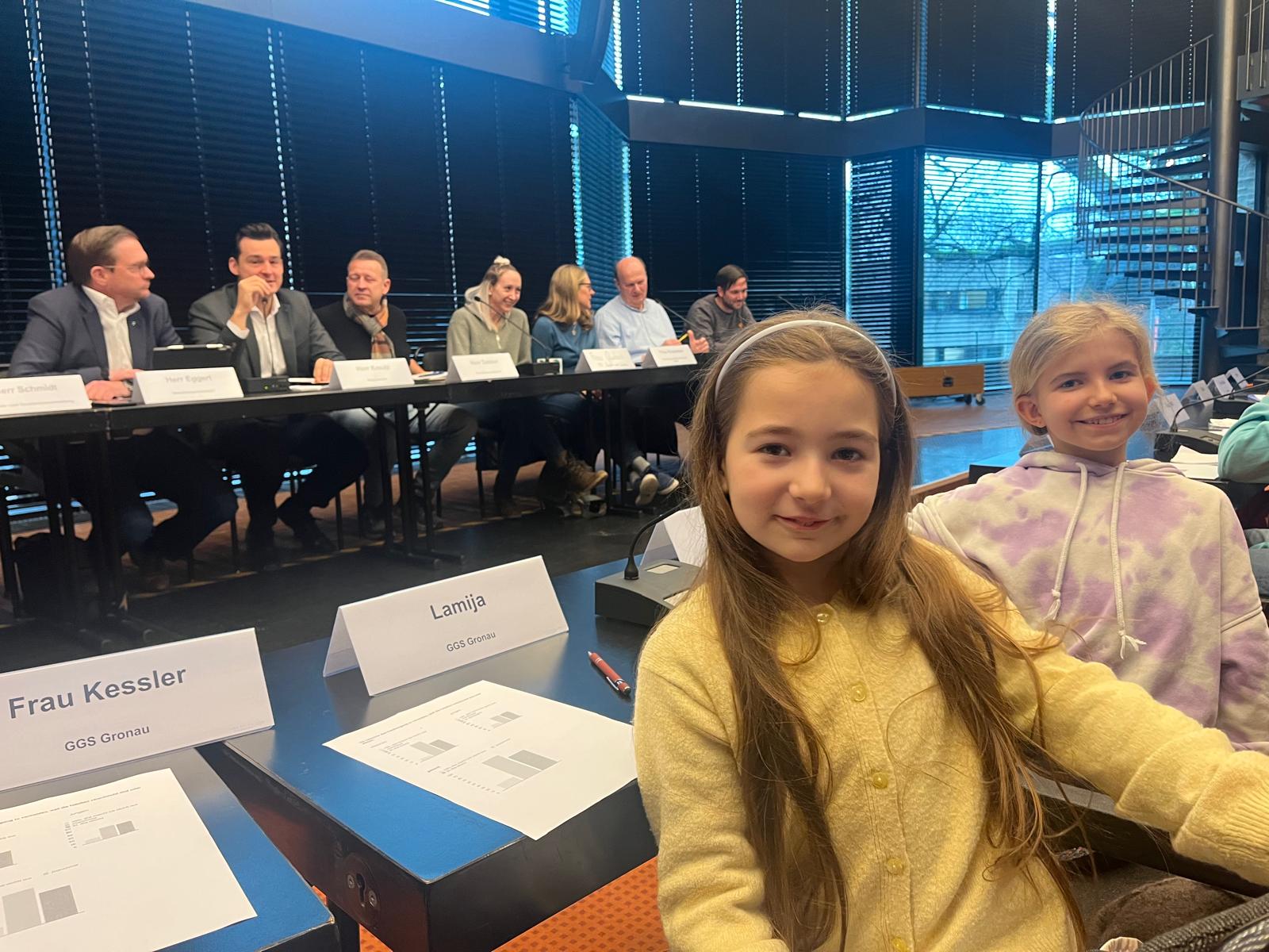 Am Freitag, den 28. Februar nahmen unsere beiden Schulsprecherinnen Nila (4b) und Lamija (3a) gemeinsam mit Frau Kessler an der Kinderratssitzung im Bensberger Rathaus teil. In der Sitzung wurde – ähnlich wie in politischen Gremien der Erwachsenen – engagiert über aktuelle Themen diskutiert. Besonders im Fokus standen dabei die Toilettenproblematik, die Schulwegsicherheit, die Digitalisierung sowie der Mangel an Spiel- und Sportgeräten auf dem Schulhof.