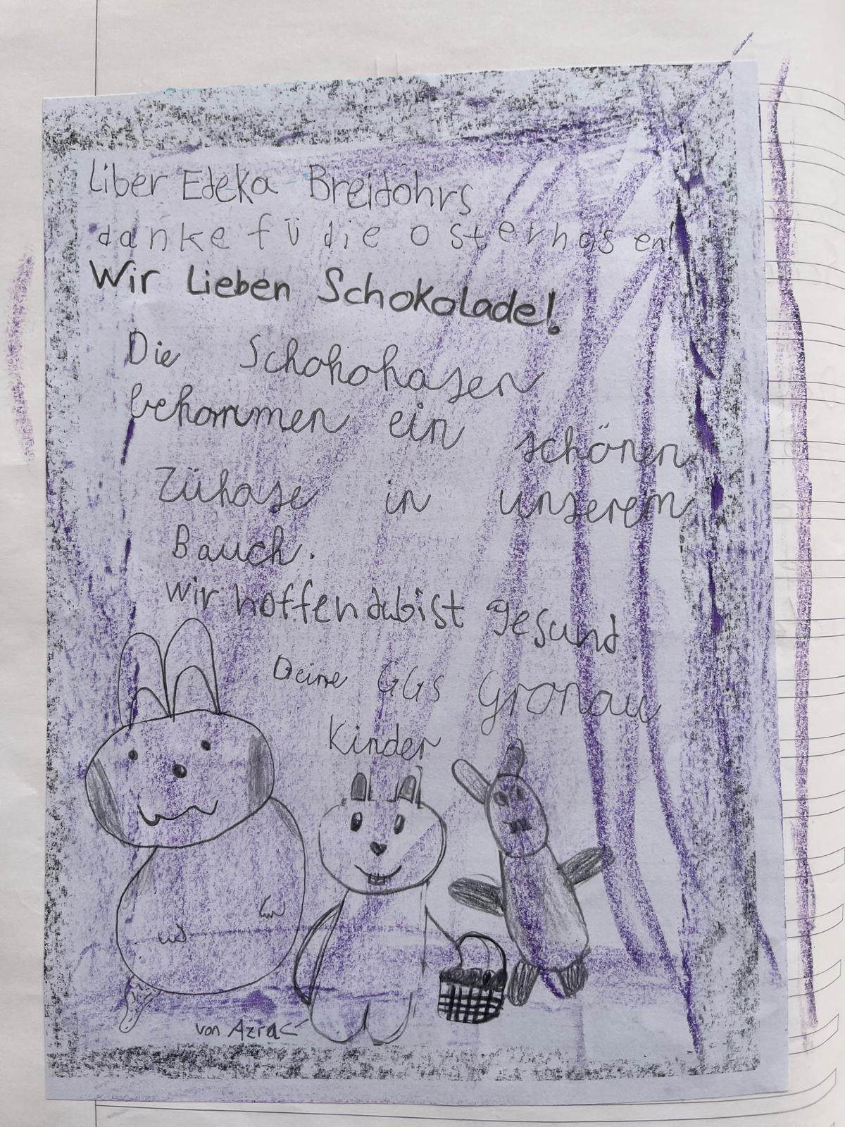 Für die fleißige Hilfe beim Müllsammeln in der Umweltwoche gab es schließlich noch für alle Kinder einen Schokoladenosterhasen. Die Hasen wurden organisiert von Herrn Cürten, der im Stadtteil Gronau sehr aktiv ist und darüber hinaus als Ehrenamtler in unseren vierten Klassen arbeitet. Gespendet wurden sie vom EDEKA Breidohrs. Vielen Dank Herr Cürten und vielen Dank auch an die Verantwortlichen von EDEKA Breidohrs. Wir haben uns sehr gefreut.